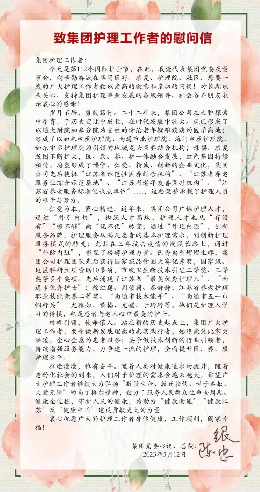 希望全體護(hù)理同仁今后的工作中,努力提高自己的業(yè)務(wù)知識水平,以細(xì)心、愛心和責(zé)任心,為維護(hù)在院長者身體健康貢獻(xiàn)自己的力量,在工作中實(shí)現(xiàn)自身的人生價(jià)值。