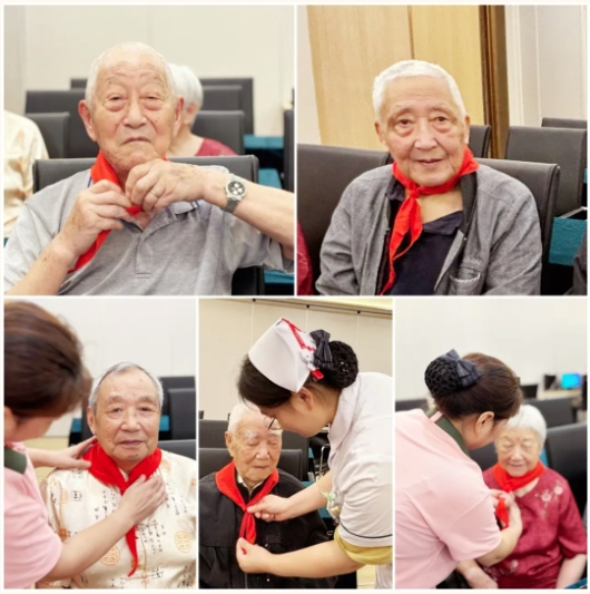 我們?yōu)樵?jīng)身為老師的長者們戴上紅領(lǐng)巾,讓他們仿佛瞬間回到了往昔的校園時光,再次感受到那份熟悉的溫暖與激情。