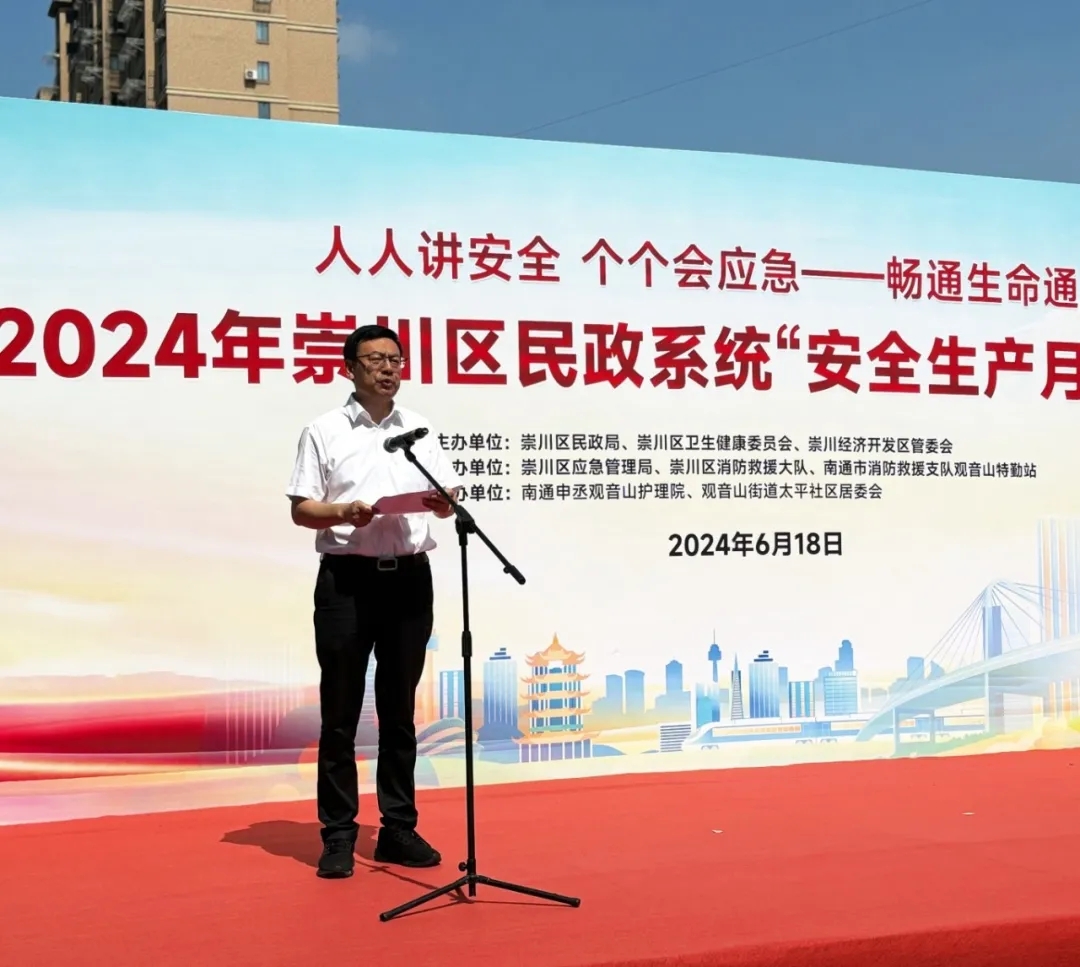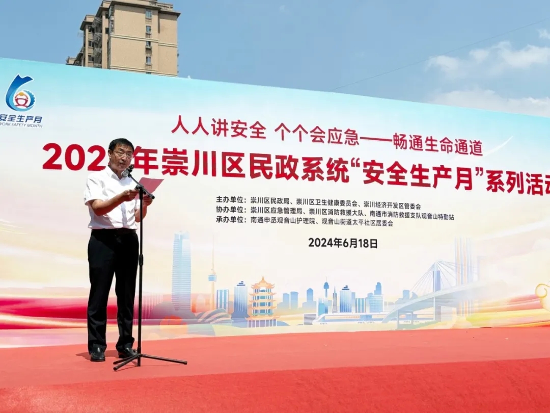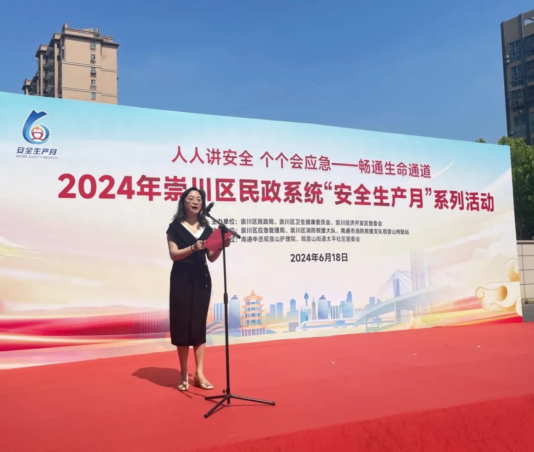 安全生產(chǎn)是民生之本,是社會和諧穩(wěn)定的重要保障,6月18日上午崇川區(qū)民政系統(tǒng)“安全生產(chǎn)月”系列活動在我院舉行,本次活動由崇川區(qū)民政局、崇川區(qū)衛(wèi)生健康委員會、崇川經(jīng)濟開發(fā)區(qū)管委會主辦。崇川區(qū)應(yīng)急管理局、崇川區(qū)消防救援大隊、南通市消防救援支隊觀音山特勤站協(xié)辦。南通申丞觀音山護(hù)理院、觀音山街道太平社區(qū)居委會承辦。南通市民政局副局長朱鴻,崇川區(qū)人民政府副區(qū)長周勇,南通市民政局安監(jiān)處處長王亞軍,崇川區(qū)民政局黨組書記、局長陳小燕,崇川區(qū)安委辦主任、區(qū)應(yīng)急管理局黨委書記、局長周煒鑫,崇川經(jīng)濟開發(fā)區(qū)管委會副主任、觀音山街道辦事處主任楊建東出席活動。區(qū)民政局、區(qū)衛(wèi)生健康委員會、區(qū)消防救援大隊相關(guān)領(lǐng)導(dǎo),各街道分管民政工作的副主任,各街道社會事業(yè)辦主任,各民政服務(wù)機構(gòu)主要負(fù)責(zé)人,區(qū)衛(wèi)生系統(tǒng)代表120余人參加活動。